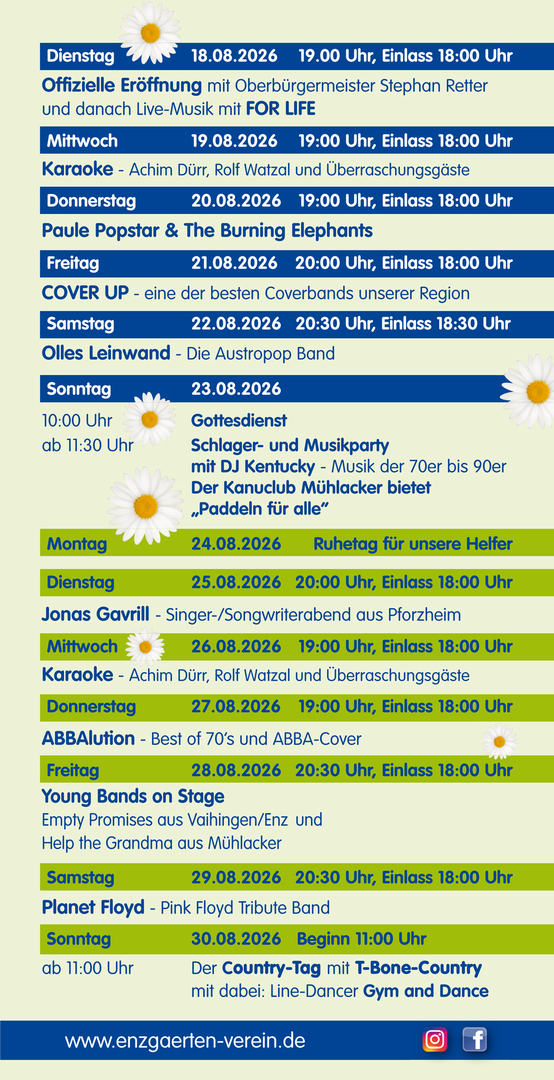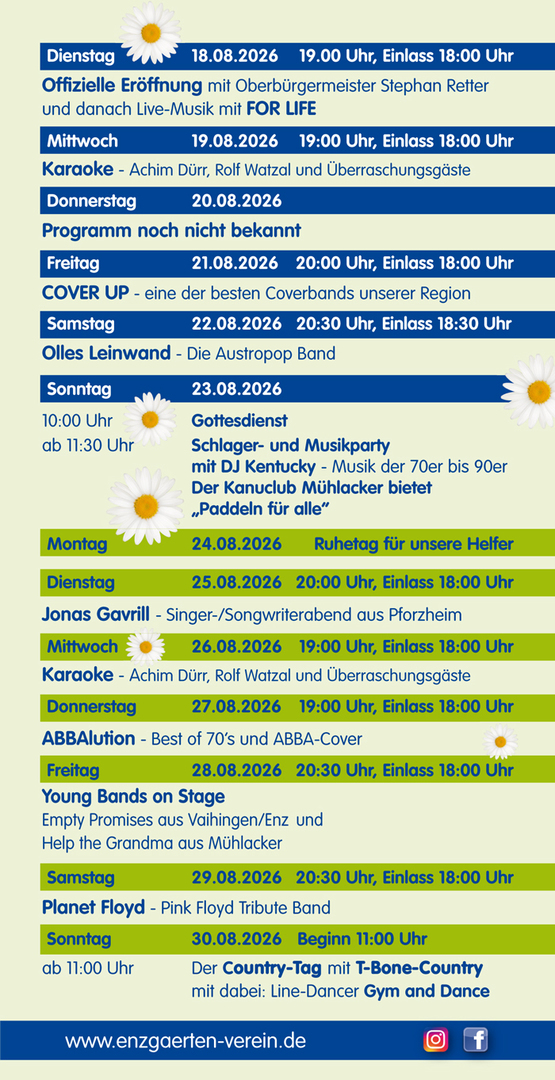 Wir wollen von Dienstag, den 18. August bis Sonntag, den 30. August 2026 wieder an der Stillen Enz in Mühlacker mit euch feiern.
