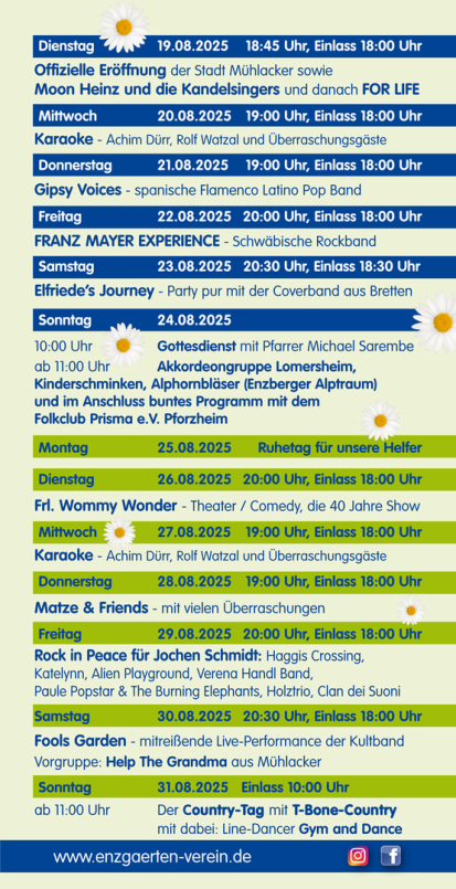 In diesem Jahr feiert unser Verein sein 10-jähriges Jubiläum und wir trumpfen im Rahmen unserer SommerevENZ 2025 mit einem vorzüglichen Kulturprogramm auf von Dienstag, den 19. August bis Sonntag, den 31. August 2025 und zwar - wie immer - bei kostenlosem Eintritt unter freiem Himmel.