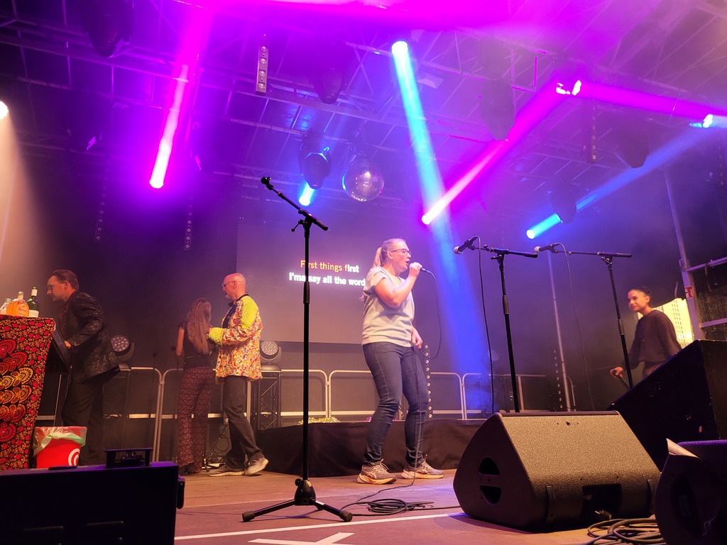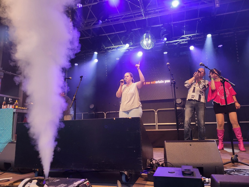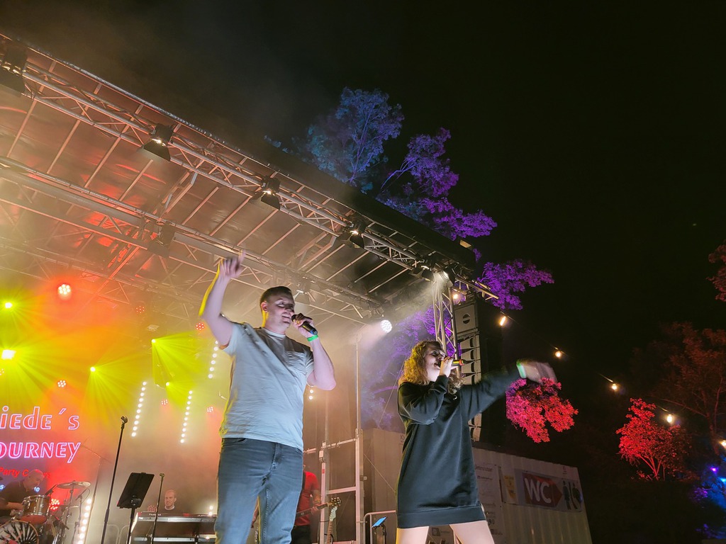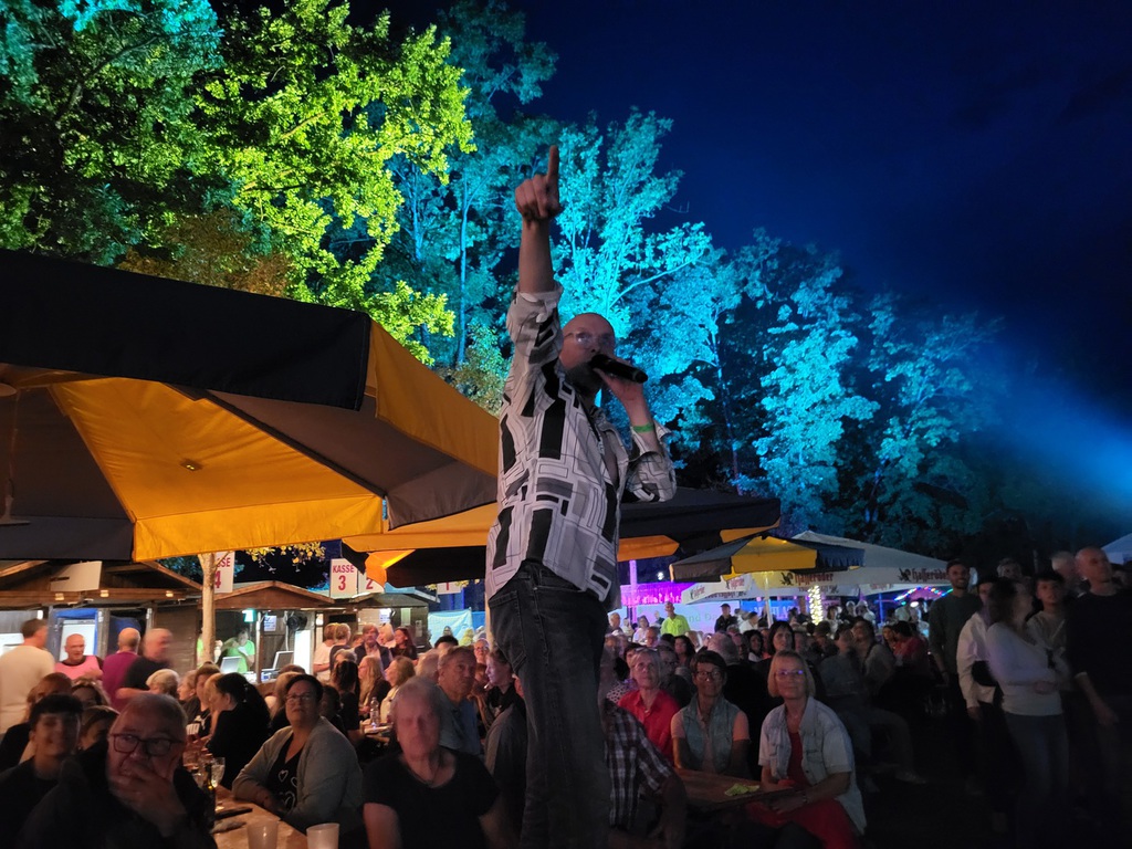 Rolf Watzal und Achim Dürr moderierten diesen Abend souverän und mit viel Witz. Unterstützt wurden sie von stimmgewaltigen Künstlern aus der Region, als da wären: Peli, Matze Gutstein und Anny Maleyes. Zur Eröffnung des Abends machten diese Stars gleich mal ordentlich Stimmung mit den ersten Cover- und Karaoke-Songs bis sich die ersten Schlangen vor der Bühne bildeten mit wagemutigen Besuchern, die sich ans Mikrofon trauten. Auf Wunsch und bei Bedarf wurden sie von den Künstlern gesanglich dezent unterstützt.