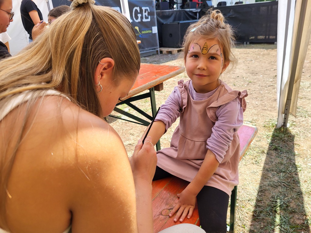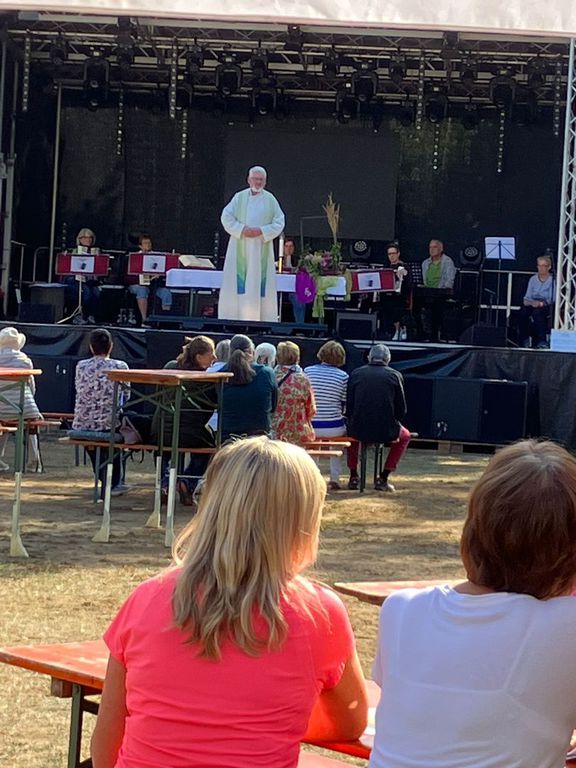 Bei strahlendem Sonnenschein fanden sich ca. 150 Besucher ein um mit Pfarrer Michael Sarembe einen Gottesdienst im Grünen zu feiern. Musikalisch hat die Akkordeongruppe Lomersheim diesen Vormittag begleitet. Danach gaben die Alphornbläser "Enzberger Alptraum" mit ihren eindrucksvollen Musikinstrumenten ein Stelldichein. Mitglieder von Gym and Dance schminkten derweil die zahlreich erschienen Kinder. Wer sich in die Warteschlange einreihte, konnte frisch gebackene Waffeln genießen.
